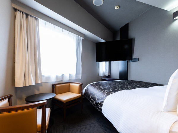 ダブルルームの客室です。テレビが壁掛けのお部屋となります。