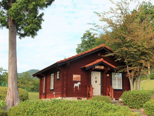 【ログハウス(例)】緑豊かな敷地内に佇むスウェーデン直輸入のログハウス。前には湖東平野が広がります。