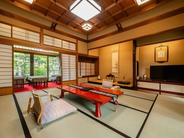 【庭園付き離れ松風庵:曲水】客室露天風呂付き:2025年3月にリニューアルした和洋室タイプの特別室。