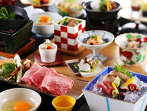 ≪お部屋おまかせでお得≫【食事時間17:30】旬の味覚を敷きつめた黒毛和牛付き御膳|1000円金券付