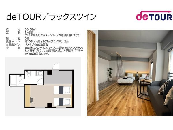 deTOURデラックスツインルーム室内。フローリング仕様となり靴を脱いでご自宅のようにお過ごし頂けます。