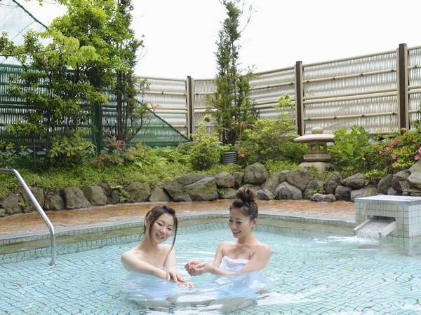 露天温泉風呂で開放感を満喫♪(午前は男性用、午後は女性用)※撮影用にバスタオルを着用