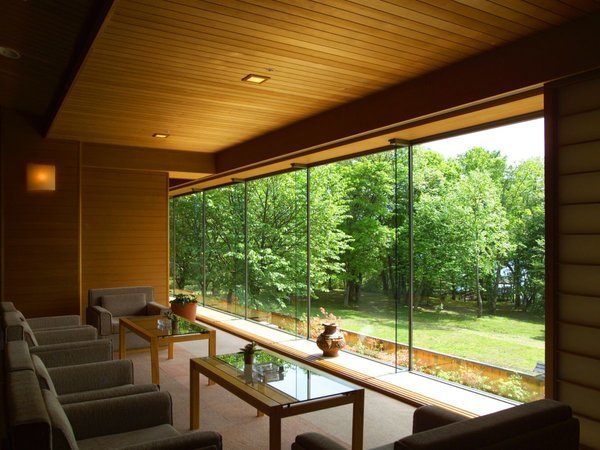 【1Fラウンジ】緑豊な庭園を眺められます。