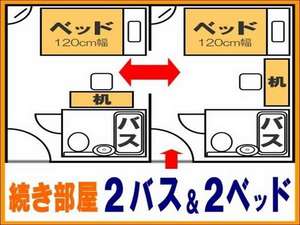 隣同士のシングル2部屋をご用意。お部屋の中にあるドアを開放することで、お部屋の外に出ることなく、お互いのお部屋を自由に行き来できるタイプのツインルーム。
