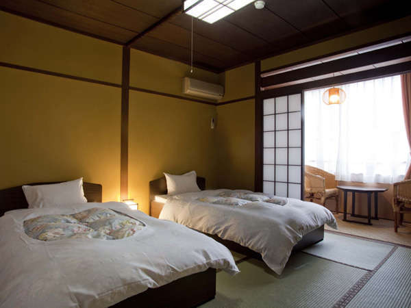 畳敷きの山宿らしい民芸風な色使いの和室感染症対策でお布団を先敷きしています【禁煙】