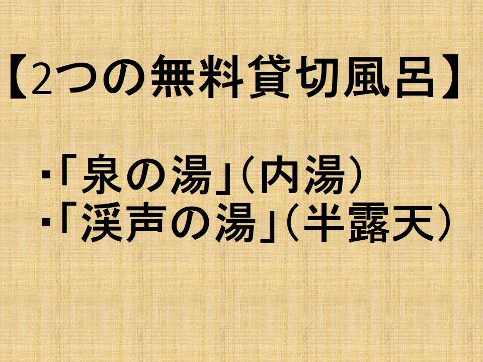 温泉 四万温泉(天然温泉100%) 温泉掛け流し※人工温泉含まず 露天風呂 あり(男女どちらか1つのみ(混浴含む)・貸切可) 貸切風呂 あり 露天 内湯 サウナ 男 女 混浴 男 女 混浴 男 女 混浴 0 0 1 0 0 1 0 0 0 風呂利用条件 大浴場はございません。2つの無料貸切風呂を空いていればご自由にお入りいただけます。利用時間14:00〜10:30