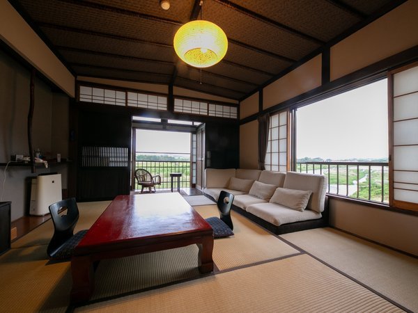 【2階高天井和室】鮎の遡上で知られる那珂川を眼下に眺めながら、ゆったり流れる時間をお楽しみください。