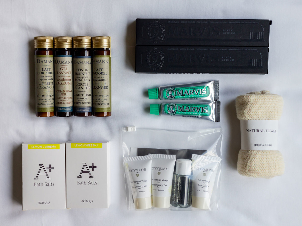 ○ ハンドタオル ○ ボディソープ ○ ドライヤー ○ 温水洗浄トイレ ○ 歯ブラシ・歯磨き粉 × 石けん ○ 羽毛布団 ○ くし・ブラシ ○ バスタオル ○ 浴衣 ○ 髭剃り ○ シャンプー