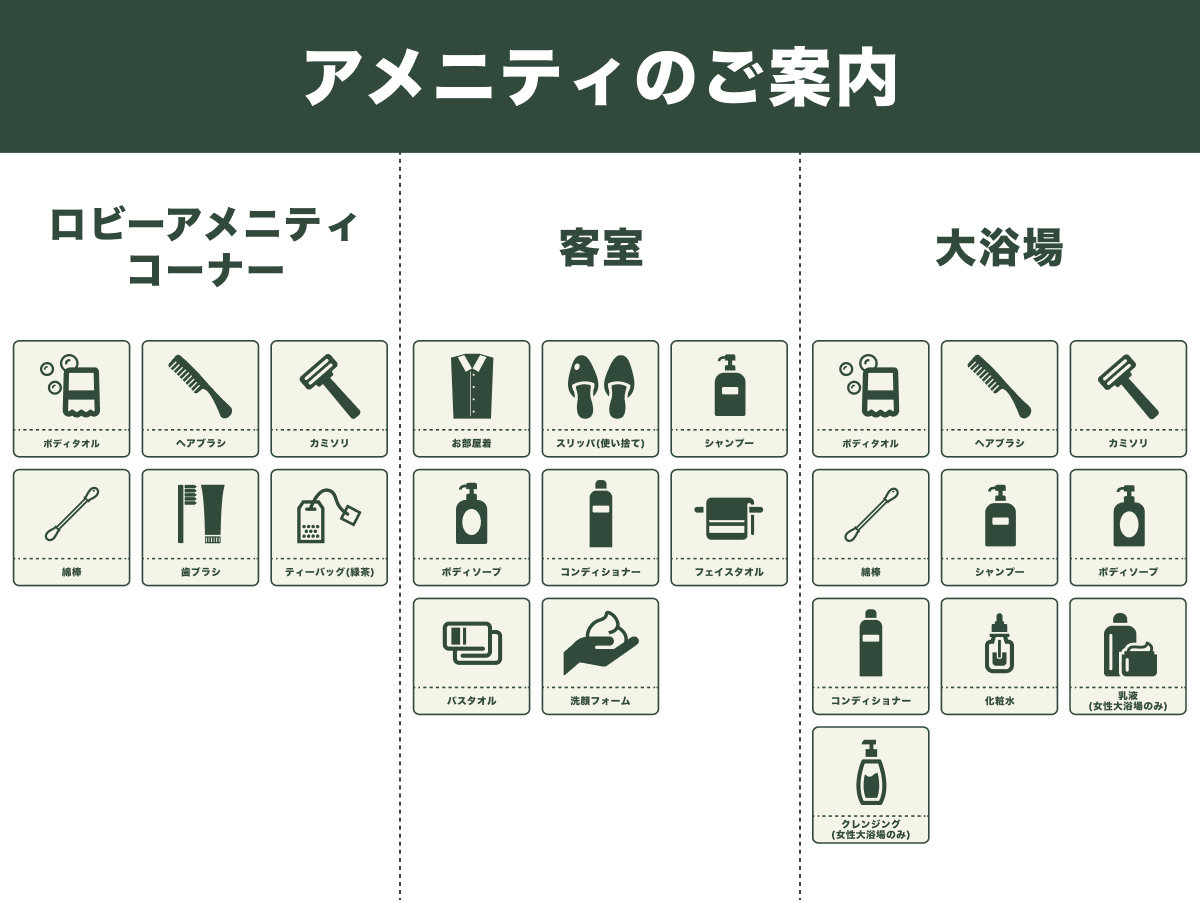 ○ ハンドタオル ○ ボディソープ ○ ドライヤー ○ 温水洗浄トイレ ○ 歯ブラシ・歯磨き粉 × 石けん ○ 羽毛布団 ○ くし・ブラシ ○ バスタオル ○ 浴衣 ○ 髭剃り ○ シャンプー