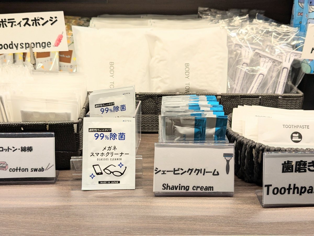 ○ ハンドタオル ○ ボディソープ ○ ドライヤー ○ 温水洗浄トイレ ○ 歯ブラシ・歯磨き粉 ○ 石けん ○ 羽毛布団 ○ くし・ブラシ ○ バスタオル × 浴衣 ○ 髭剃り ○ シャンプー