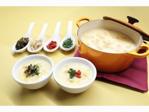 「中華料理李白特製松の実入り中華粥」丹念に煮込んだ鶏だしと、お米マイスターが厳選したお米を使用。 |