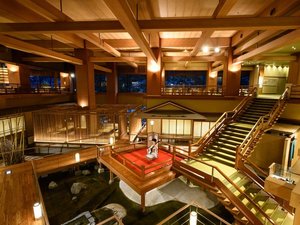 ロビーの浮き舞台では三味線の生演奏でお出迎え |