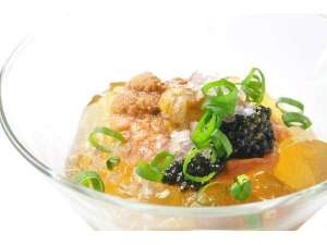 カリフラワーのムースとコンソメジュレ ボタンエビ・海水ウニのせ |