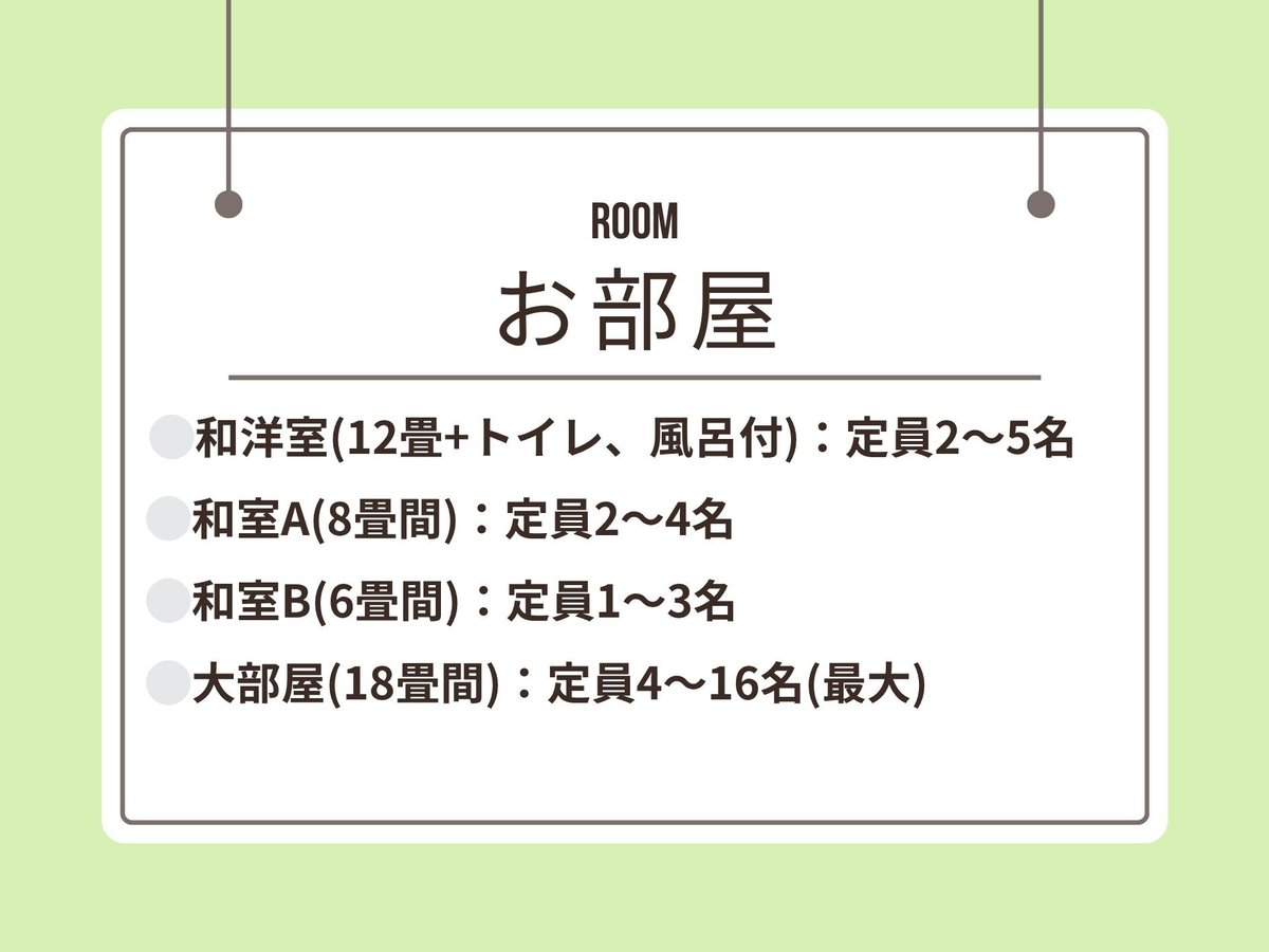 洋室 和室 和洋室 その他 総部屋数 0室 16室 2室 0室 18室 部屋補足 全室禁煙 標準的な部屋設備 全室冷暖房・テレビ・空の冷蔵庫 インターネット関連 全室対応