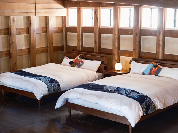 Suite with Hanui|蔵のダイナミックな梁を臨む2Fベッドルームに盆踊衣装を特別展示したメゾネットルーム
