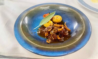 ≪Poisson≫ 戻りカツオの香草パン粉焼き 鮑のバターソテー スダチのヴァンブランソース
