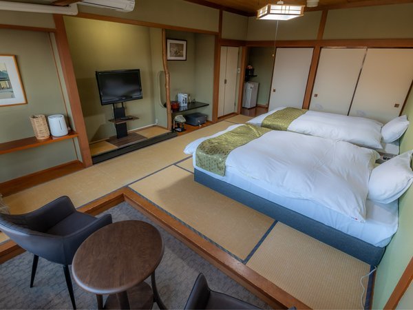 【ツインベッド】和室10畳ゆったりとしたシモンズ製セミダブルベッドを配した客室です。