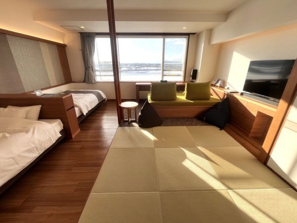 【シンクロツイン】十勝川の四季の風景をお楽しみいただけるシンクロツインルームは頭合わせのベッド配置