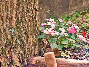 階段とインパチェンス、季節の花。 |