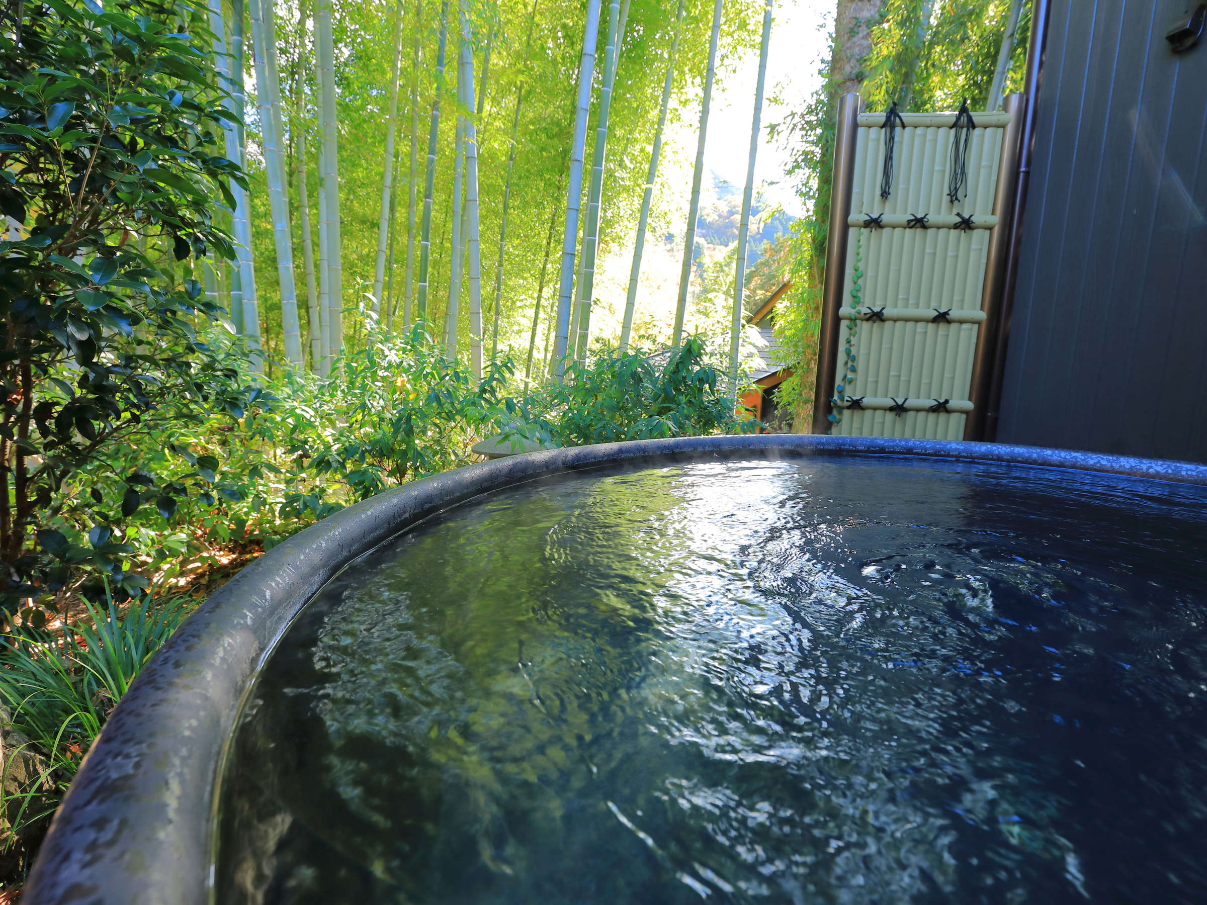 【帰天の湯】露天風呂から見える竹林。「竹取物語」の世界に浸ってリラクスタイムを…