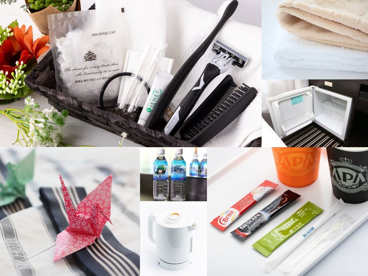 ○ ハンドタオル ○ ボディソープ ○ ドライヤー ○ 温水洗浄トイレ ○ 歯ブラシ・歯磨き粉 × 石けん ○ 羽毛布団 ○ くし・ブラシ ○ バスタオル ○ 浴衣 ○ 髭剃り ○ シャンプー