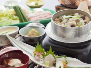 絶妙なうまみの自慢のお鍋、旬の釜飯をはじめ、お造りや小鉢等も付いてボリュームも満点のご夕食です。