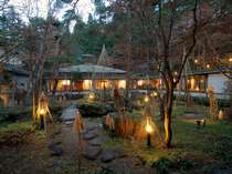 優しい光がともる仙壽閣の夕べ。庭園がしっとりと美しい時です。正面は湯けむり薫る温泉の湯殿です