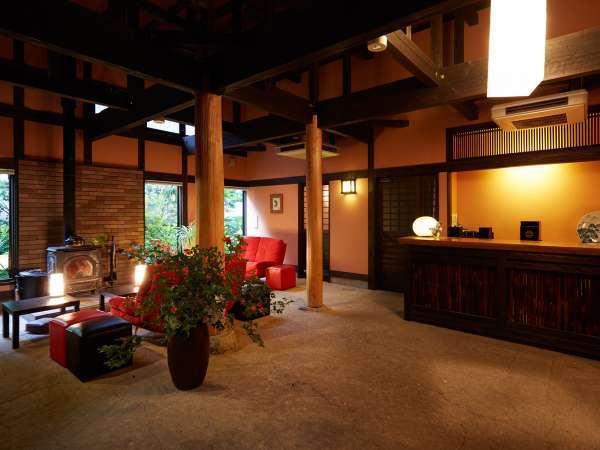【ロビー】フロント前のエントランスには暖炉があり、落着く空間となっております。