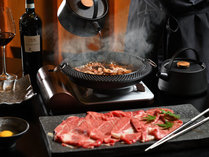 夕食はレストランで優雅に【厳選和牛コース】香り立つ炭火焼&絶品すき焼き!目の前で仕上げる和牛を堪能