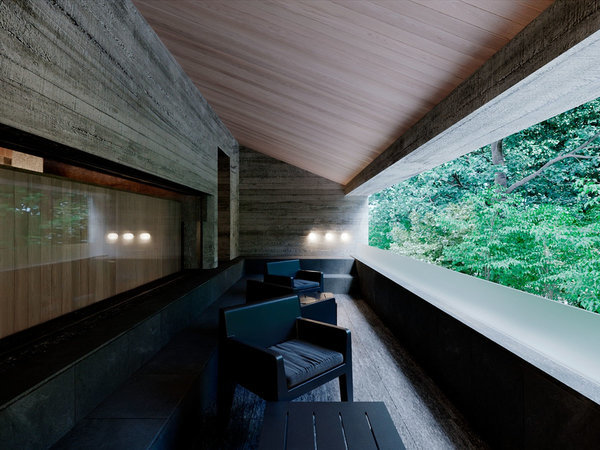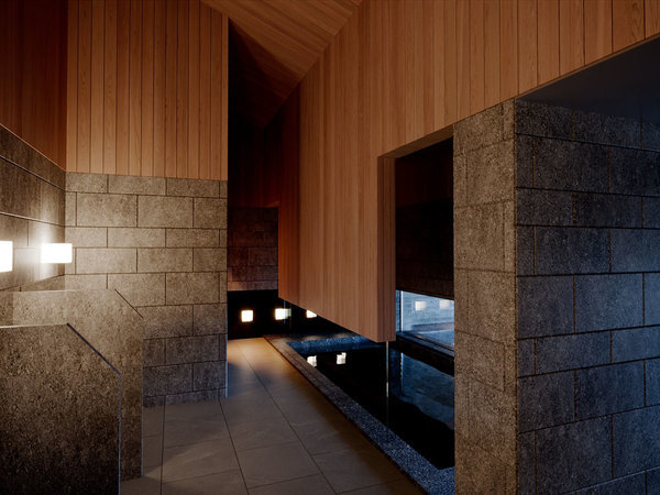 【部屋】2つの宿泊棟、貸切風呂棟、ロビー棟、食事棟のすべてが渡り廊下で連なる独創的な空間