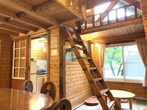 コテージのリビングリビングから見た。ロフト部分。一部吹き抜け構造。階段梯子が急です。 |