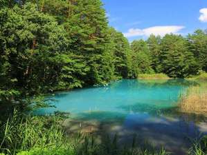 *五色沼の一つ青沼は、目が覚めるような青さ。散策が大人気です。 |