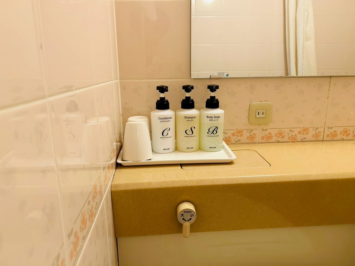 ○ ハンドタオル ○ ボディソープ ○ ドライヤー × 温水洗浄トイレ ○ 歯ブラシ・歯磨き粉 × 石けん × 羽毛布団 × くし・ブラシ ○ バスタオル ○ 浴衣 ○ 髭剃り ○ シャンプー
