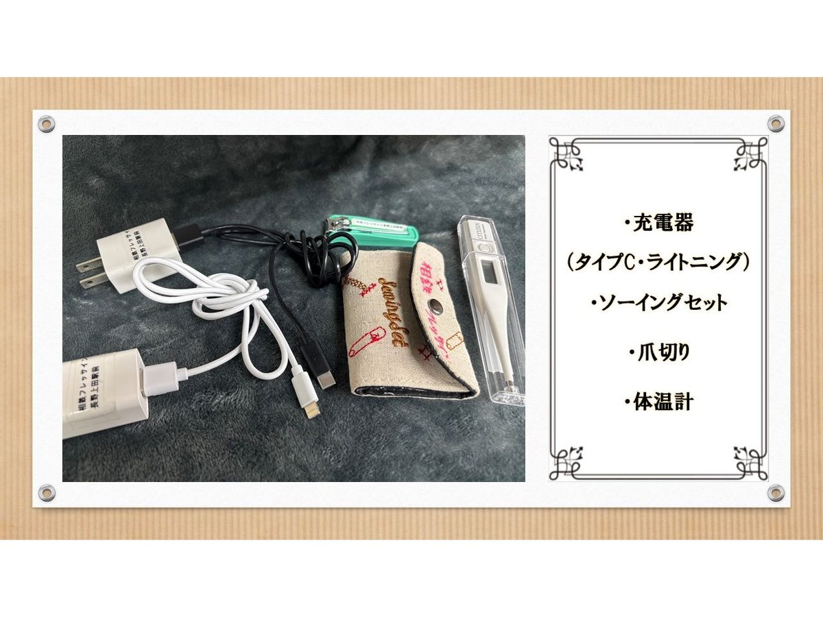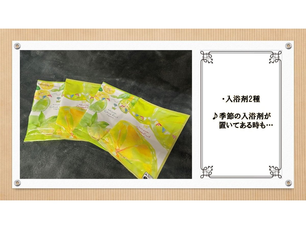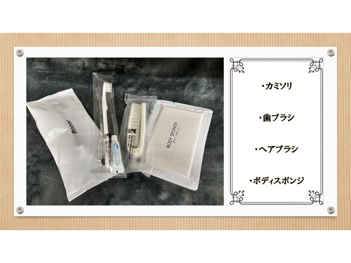 ○ ハンドタオル ○ ボディソープ ○ ドライヤー ○ 温水洗浄トイレ × 歯ブラシ・歯磨き粉 × 石けん × 羽毛布団 × くし・ブラシ ○ バスタオル × 浴衣 × 髭剃り ○ シャンプー
