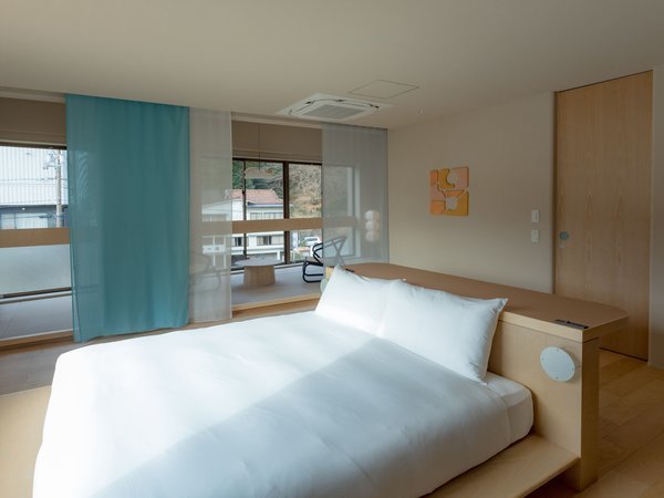 【リバービュースイート】54u/ キングベッド1台 ベッド正面の大きな窓から音信川を一望