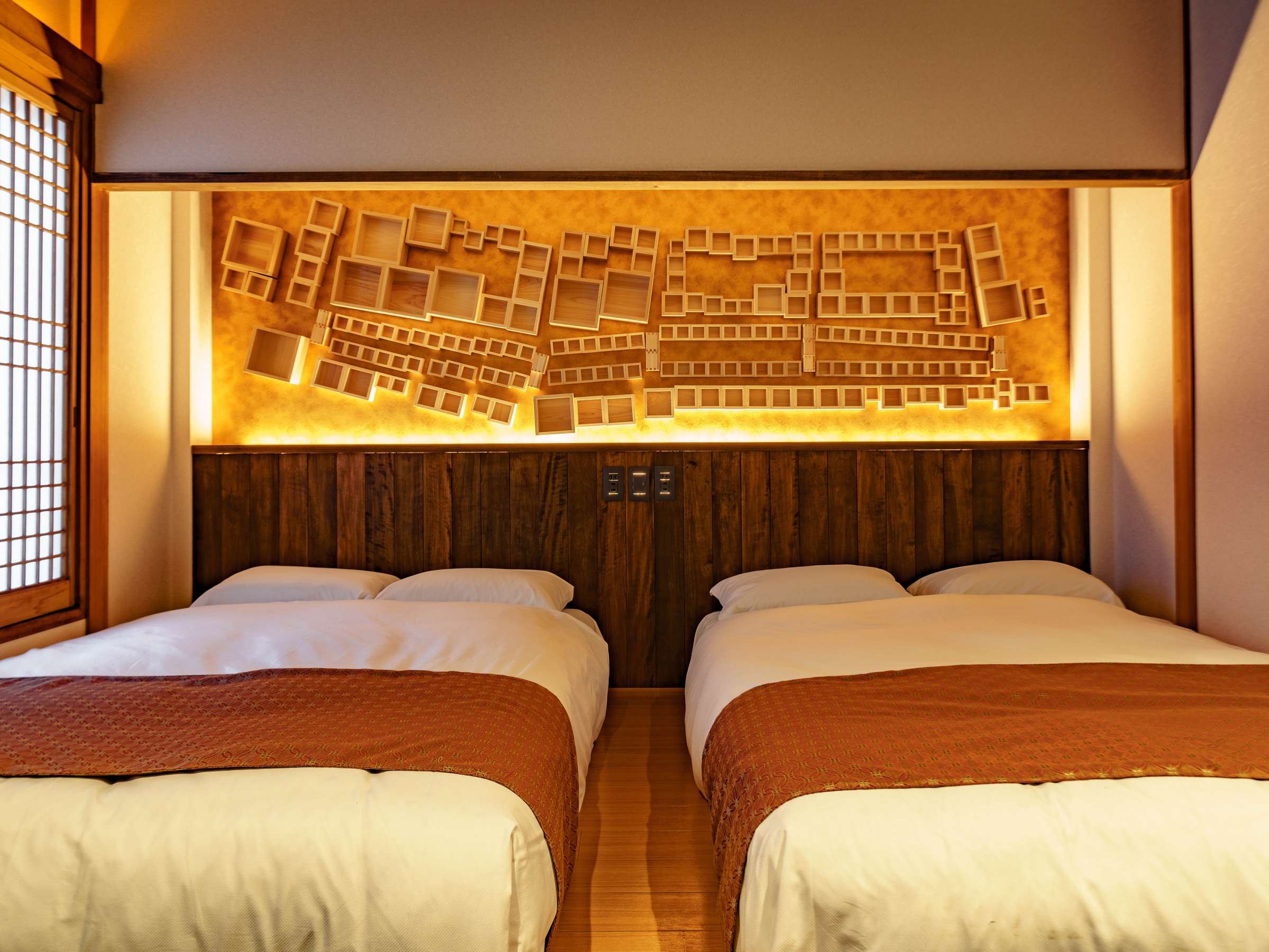 コンセプトでもある樽廻船の歴史を物語る大きなテーブル、酒を注ぐ枡をイメージした屋上露天風呂、船着き場の街並みを枡で再現した寝室、大迫力のプロジェクター等、当施設ならではの魅力が盛り沢山! |