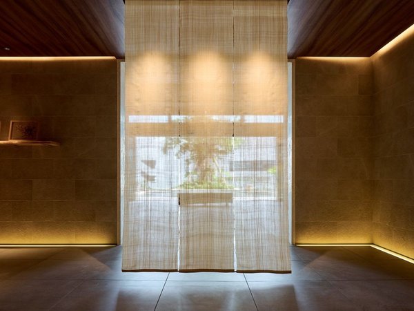 7Fでゲストを迎えるのは芭蕉布のスクリーンと、その先に見える琉球アカギのベンチとガジュマル。