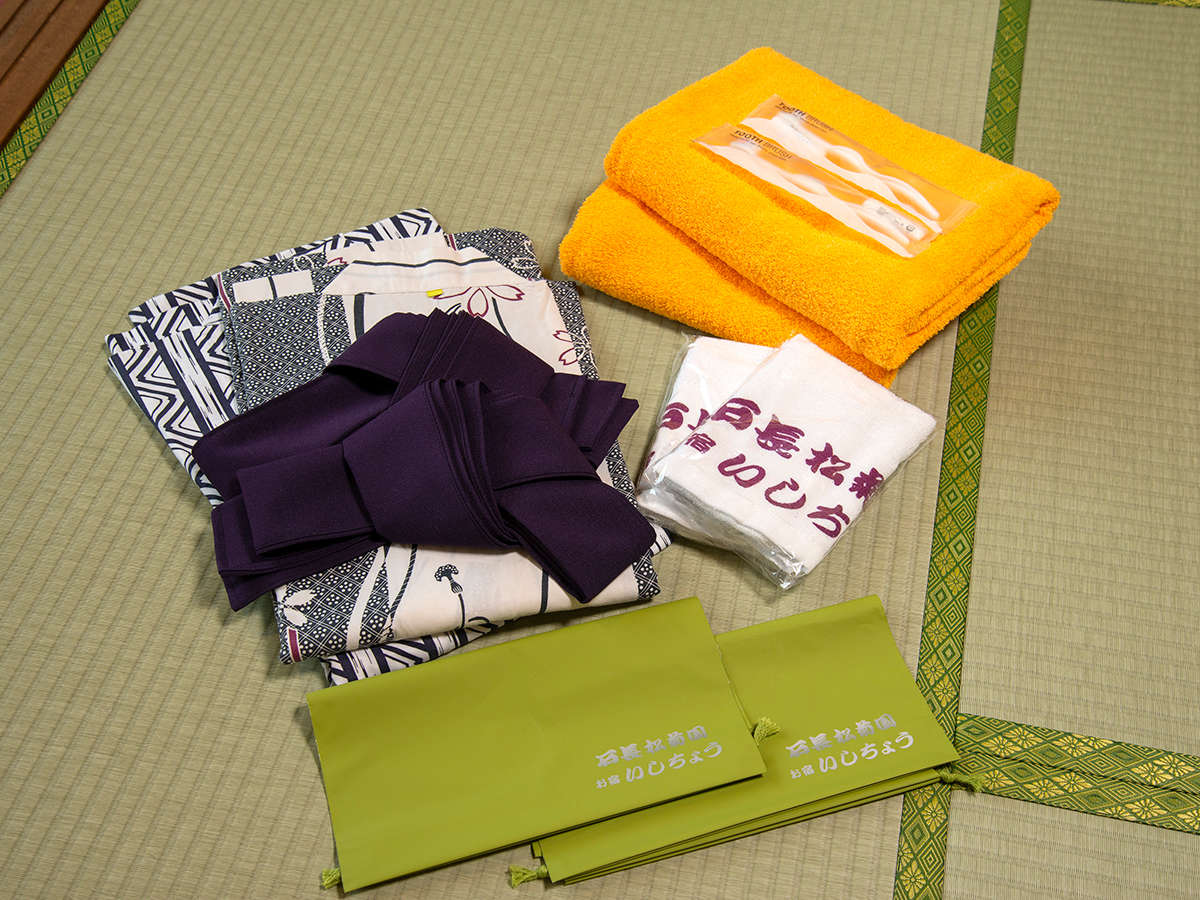 ○ ハンドタオル ○ ボディソープ ○ ドライヤー ○ 温水洗浄トイレ ○ 歯ブラシ・歯磨き粉 ○ 石けん ○ 羽毛布団 ○ くし・ブラシ ○ バスタオル ○ 浴衣 × 髭剃り ○ シャンプー
