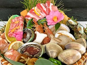 ・海鮮浜焼き(さざえ、鮑、帆立、海老、干物など五種&牛肉、