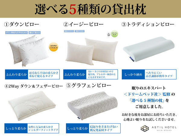 各階に選べる5種類の枕ご用意しております。ご自由にお使いください。
