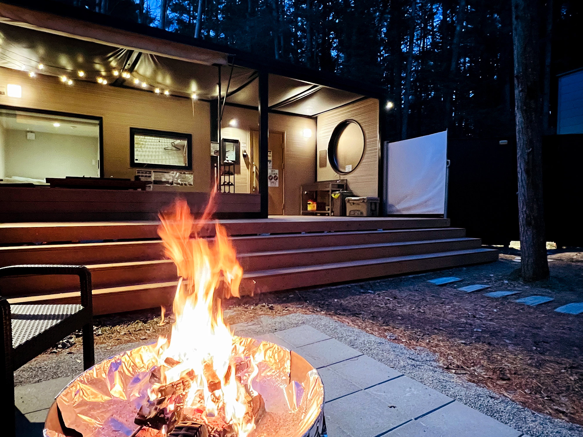 2022年8月オープン!塀に囲まれた安心の1棟貸しプライベート空間で贅沢グランピング。天然温泉露天風呂&テントサウナで癒され、富士の森で囲炉裏BBQや冬でも自然を満喫! |