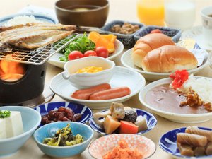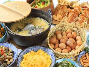 朝食には和洋バイキングのご用意!郷土料理をお楽しみください。 |