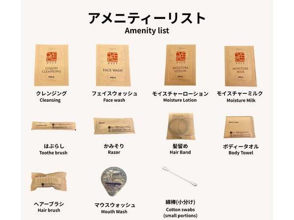 | ○ | ハンドタオル | ○ | ボディソープ | ○ | ドライヤー | ○ | 温水洗浄トイレ |