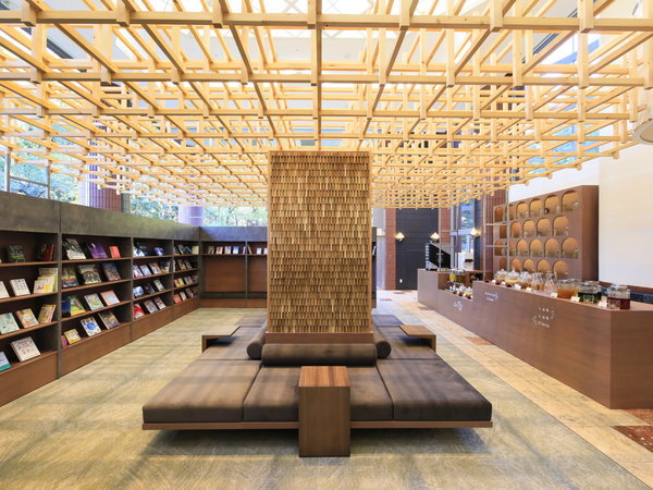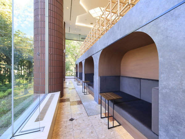 【ラウンジ】整然とした木組みと柔らかな光に癒されるくつろぎのスペース