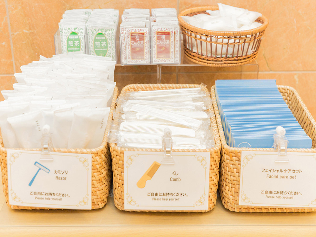 ○ ハンドタオル ○ ボディソープ ○ ドライヤー ○ 温水洗浄トイレ × 歯ブラシ・歯磨き粉 × 石けん ○ 羽毛布団 × くし・ブラシ ○ バスタオル × 浴衣 × 髭剃り ○ シャンプー