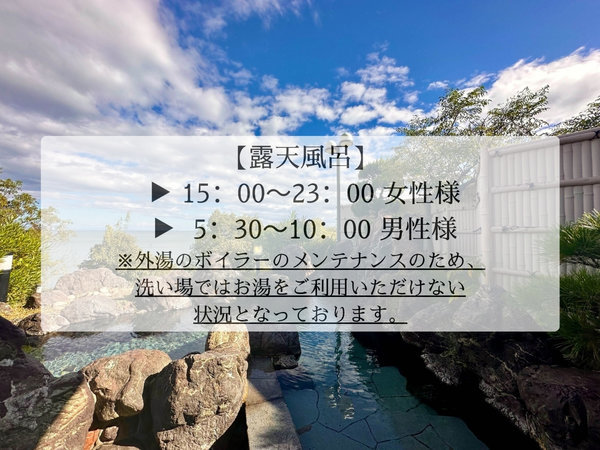 メンテナンスの影響により、露天風呂の洗い場はご利用いただけません。なお、男女入替制となっております。